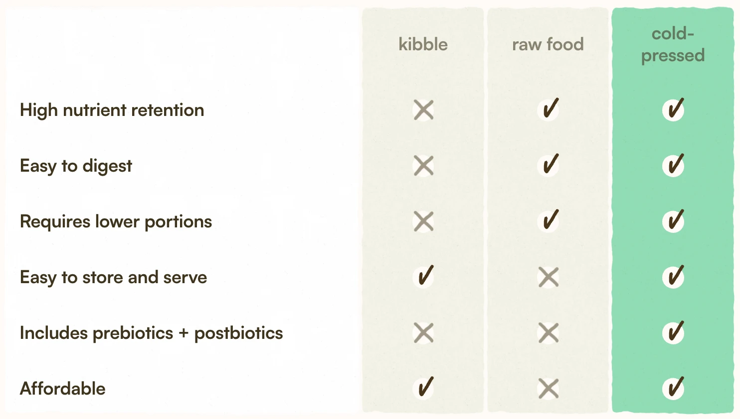 Cold-pressed food is made without high heat, preserving more nutrients and making it easier to digest than traditional kibble.